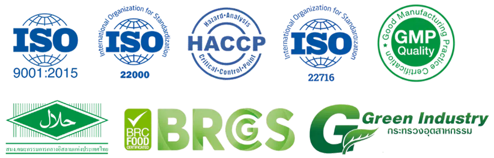 ISO 9001, GMP (Good Manufacturing Practice), HACCP / GHPs, ISO 22000 ,BRCGS, Halal, ISO 22716 และ Green Industry / BCG (Thailand) ทุกล็อตสินค้าผ่านระบบ Quality Control (QC) อย่างเข้มงวดก่อนการส่งออก เราไม่มองตัวเองเป็นเพียงผู้ขายสินค้า แต่เป็นผู้เชื่อมโยงคุณภาพไทยสู่ตลาดต่างประเทศ ด้วยความโปร่งใส ความน่าเชื่อถือ และความสัมพันธ์ระยะยาว